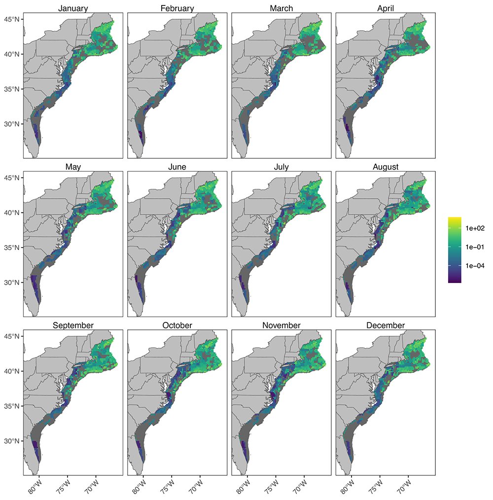 Accounting for both trap/pot and gillnet fisheries, the Fixed-Gear Fishery Layer (FGFL) described monthly variability in fixed-gear density throughout the U.S. Northwest Atlantic (Fig. 2). Gear density coastwide was lowest from January to March and steadily increased to a peak between July and October. Year-round, the greatest gear density was dispersed in northern waters from Maine to North Carolina. Gillnet fisheries had hot spots in southern New England and Gulf of Maine waters, but the greatest amount of effort existed from trap/pot fisheries in waters off the coast of Maine.