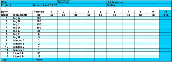 The only way the operator can control the process is by following a checklist with the formula or product type, the order of the ingredients in the formula, the bin in which each ingredient is being sourced from, and columns to generate the total amount of each ingredient used. The latter shows the total usage of ingredients in a shift or the day, and this can help consolidate ingredient inventories. An example of such a checklist is shown in Fig. 1. If a mistake is detected, the operator should record it, divert the wrong mix to a holding bin for reprocessing, and report it immediately to the QA supervisor.