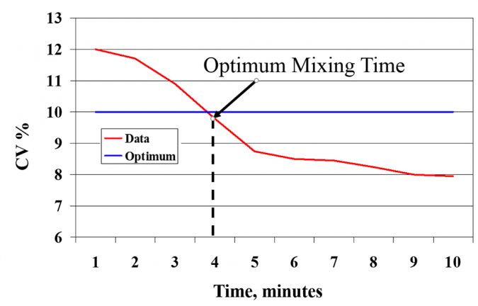The test measures the efficiency of the mixer to produce a homogenous blend at different time intervals. This is measured by the percent coefficient of variation (CV), which is the standard deviation divided by the average (10 samples at each time interval) and multiplied by 100. A CV of less than 10 percent is the standard used in the feed industry as an indication of a good mix. Therefore, if the CV is less than 10 percent at 4 minutes, the operator must ensure that each batch of mix is mixed for 4 minutes. A sample of a mixer data graph showing optimum mixing time is shown in Fig. 2.