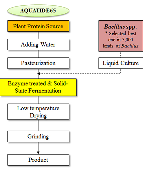 AQUATIDE65 is a fishmeal replacement manufactured by CJ Cheildang that is bio-processed (fermentation and enzyme treatment) with a mixture of soybean meal and corn gluten meal via a process incorporating Bacillus subtilis. The results of this manufacturing/fermentation process are increased protein content, peptide contents, digestibility and palatability; and minimized content of anti-nutritional factors. We believe it has significant potential as a fishmeal replacement product for aquafeeds.