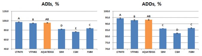 In the results for the apparent digestibility of ingredients (ADIs) and the apparent digestibility of diets (ADDs) for crude protein, shrimp fed the LTFM70 diet had significantly higher levels than those for shrimp fed the VTFM65, SBM, CGM or FSBM diets (P<0.05). However, there were no significant differences between shrimp fed the LTFM70 and the AQUATIDE65 diets (P > 0.05). LTFM70 is well known as a high-quality fishmeal with a good amino acid profile, and high protein content and digestibility. On the other hand, despite the inclusion of plant-based protein ingredients, the AQUATIDE65 diet showed similar performance to that of the LTFM70 diet in regards to ADIs and ADDs. It appears that more than 70 percent of the total protein in AQUATIDE65 showed peptidization (≤ 30kDa) by fermentation. These results indicate that the bio-processed protein concentrate can potentially replace fishmeal at significant inclusion levels.