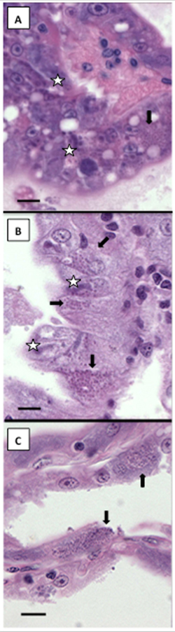 Histological examination of samples of EHP-infected Penaeus vannamei from Vietnam (2014) showed basophilic inclusions within the cytoplasm of hepatopancreas tubule epithelial cells of (Fig 1A & 1B). These inclusions appeared to be at plasmodia stage; mature, basophilic, spores were also observed. The EHP-infected P. stylirostris collected in Brunei (2006) were also showed the presence of microsporidium spores within the hepatopancreas (Fig. 1C). These results also indicate that EHP has been present in Asia since 2006.