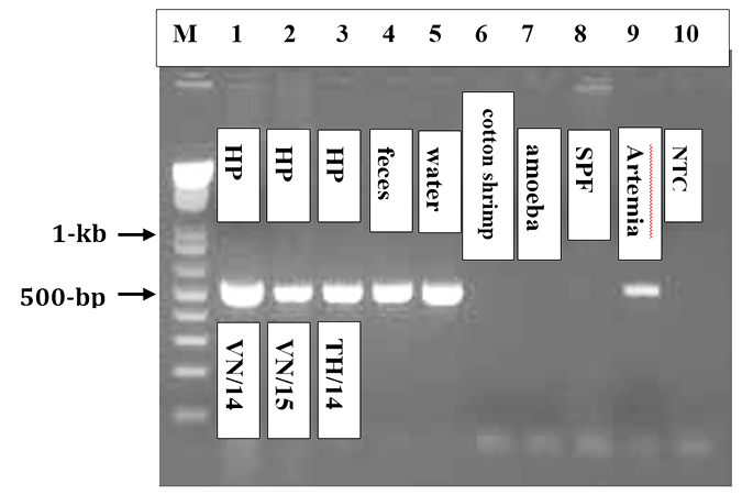 We selected primers for detecting the EHP are EHP-510F (5’-GCCTGAGAGATGGCTCCCACG) and EHP-510R (5’-GCGTACTATCCCCAGAGCCCG) and PCR was performed with DNA extracted from EHP-infected shrimp. The results showed that this PCR can detect EHP-infected shrimp (Fig. 2, lane 1-3); the feces and water samples collected from infected shrimp tanks were also detected with EHP (Fig. 2, lanes 4 & 5). We also tested 2 other parasitic pathogens, an amoeba and the cotton shrimp disease microsporidium, but these EHP-primers did not cross react with them (Fig. 2, lane 6 & 7).