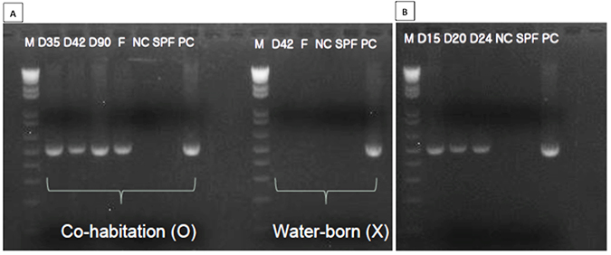Three bioassays were conducted using a population of EHP-infected shrimp sent from Thailand. In bioassay no. 1 (co-habitation group), diseased shrimp were transferred into a tank stocked with SPF shrimp tagged with visible elastomers. The SPF shrimp became infected after 35 days of co-habitation (Fig. 3A). For bioassay no. 2 (water-born infection group), only water was transferred from diseased shrimp tank into the SPF shrimp tank. The SPF shrimp were not affected even after 42 days (Fig. 3A). For bioassay no. 3, SPF shrimp were fed the hepatopancreas from the diseased shrimp. Samples were analyzed by PCR analysis every 5 days; SPF shrimp became infected at day 15 (Fig. 3B), suggesting that EHP can be transmitted via cannibalism.