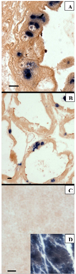 By ISH with a digoxigenin-labeled EHP probe, the infected P. vannamei (Fig 4A) and the P. stylirostris (Fig 4B) showed the presence of microsporidium spores (basophilic inclusions) within the hepatopancreas, the tubule epithelial cells. The probe appears to be highly specific. No reaction was seen with Perezia penaei-infected P. monodon showing a clinical sign of cotton shrimp disease (Fig 4C).