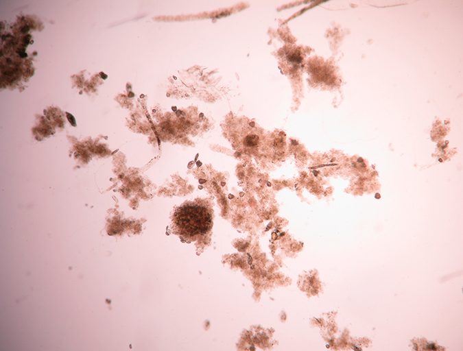 En los sistemas de cultivo de BFT, las bacterias quimio-autotróficas y heterotróficas participan en la formación de bioflocs, que también incluyen un agregado de algas, hongos, protozoos, rotíferos y nematodos. Por lo tanto, además de proporcionar control de amoníaco, los bioflocs pueden representar una fuente de alimento en los tanques de producción de camarón.