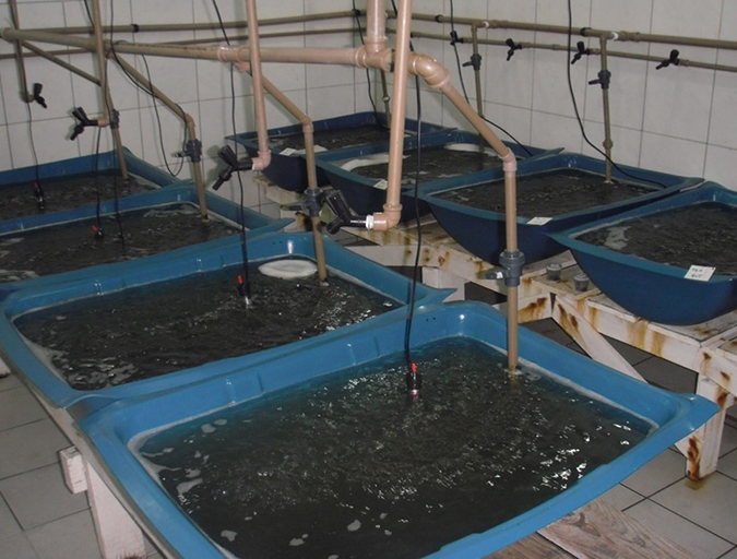 Se establecieron tres grupos de larvas: un grupo control fue criado en un sistema autotrófico convencional con recambio diario de agua y la adición de microalgas, y dos grupos experimentales fueron criados en un sistema heterotrófico sin intercambio de agua.