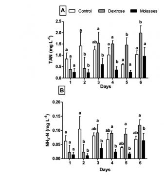Los valores medios de TAN y de amoníaco no ionizado se mantuvieron por debajo de los niveles tóxicos (amoníaco total <1,3 mg/L y amoníaco libre <0,05 mg/L). El tratamiento de melaza resulta en los valores más bajos de amoníaco, como se muestra en la Fig. 1, que también presenta la variación del perfil de TAN y amoniaco libre por tratamiento durante el experimento.
