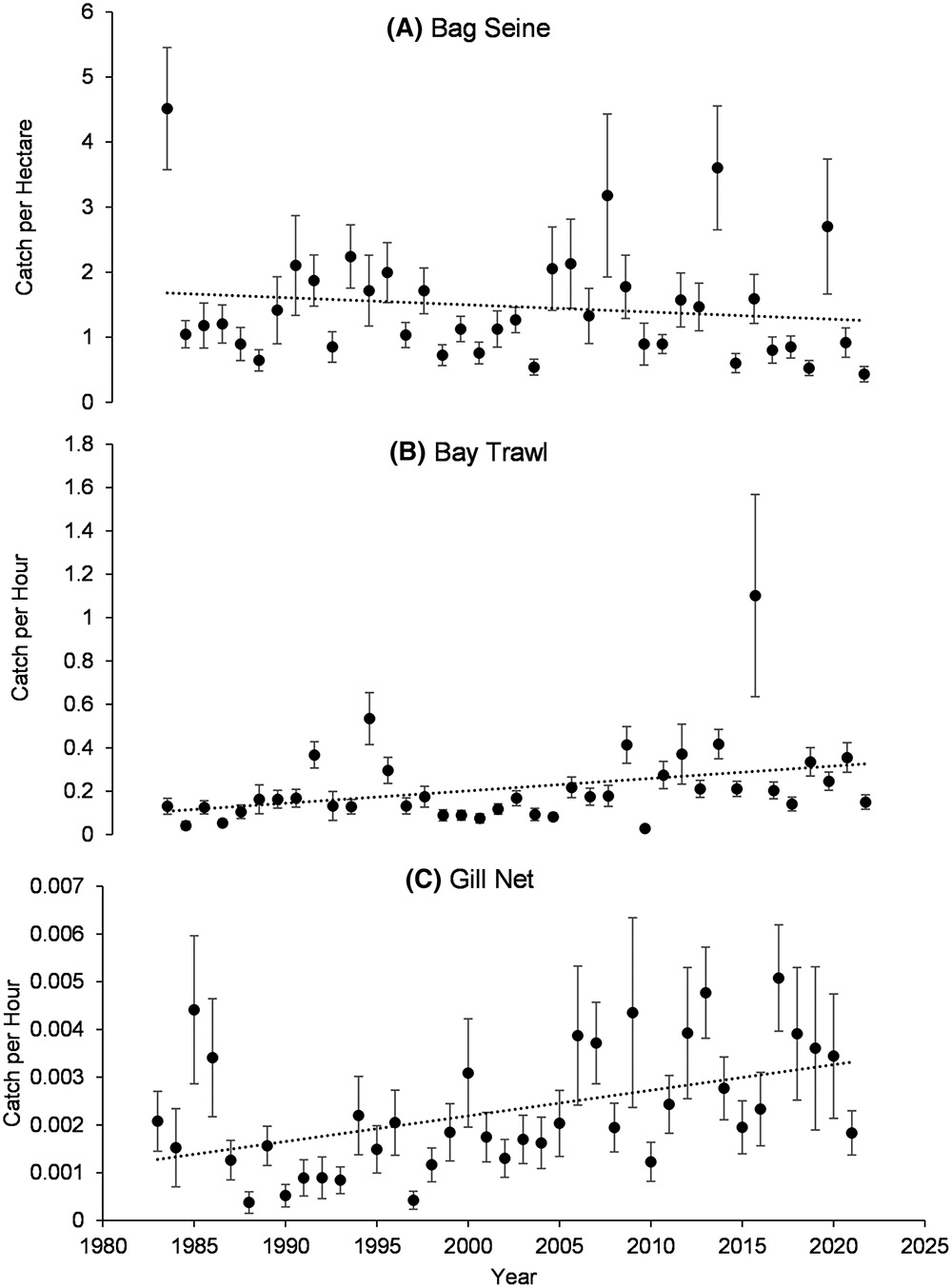 Results of this study provide important population trends for Crevalle jack in the northwestern Gulf of Mexico and can inform future fisheries management strategies for the species in Texas and possibly throughout its range. Compared to more heavily targeted species, the harvest of Crevalle jack was relatively low in Texas, and abundance was consistent throughout the time series based on fishery-independent sampling effort. These results suggest that populations are less at risk of decline in Texas compared to other areas, like Florida’s Gulf Coast. Crevalle jack were common inshore and have been documented as one of the most abundant species on Texas artificial reefs.