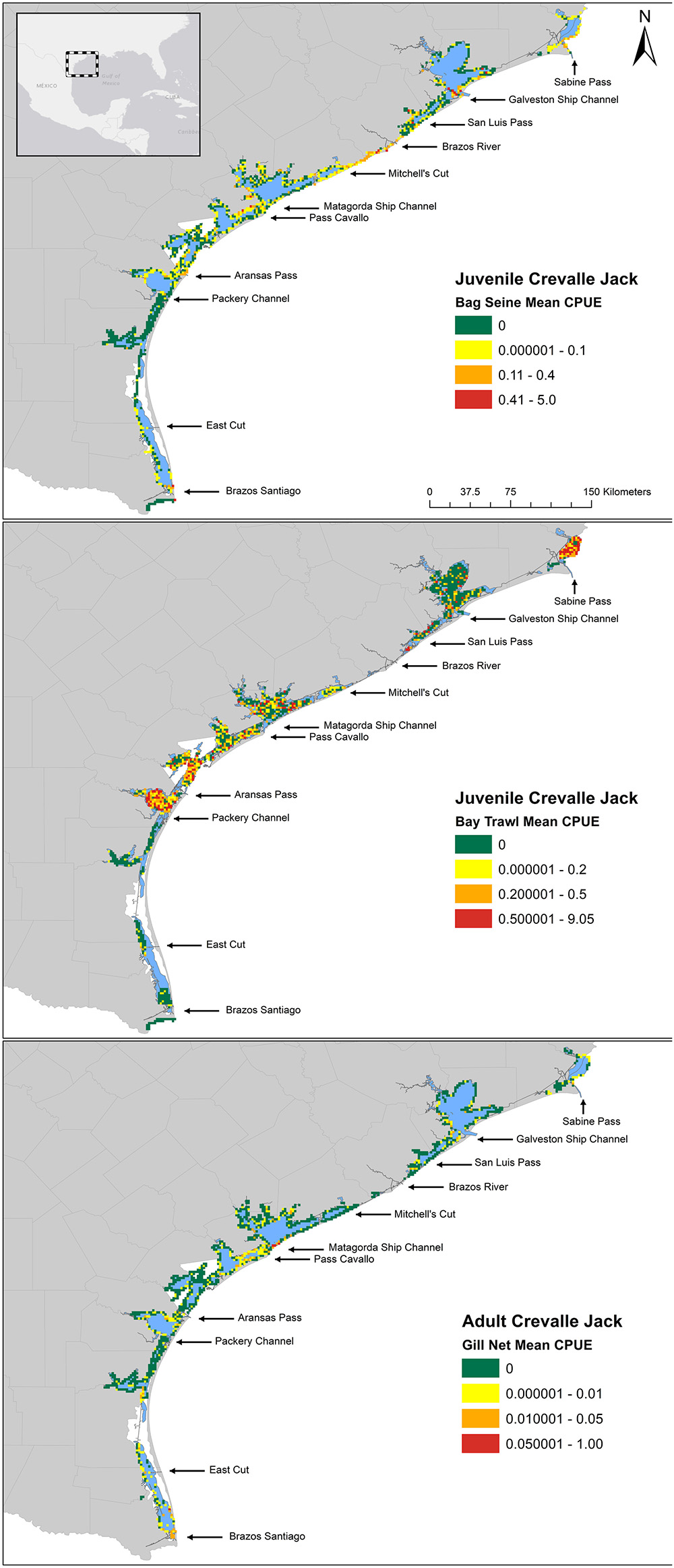 Our results showed that Crevalle jacks used Texas estuaries during all life stages based on fishery-independent sampling data. These findings were consistent with reports by other researchers of juvenile fish selectively inhabiting in-shore environments, such as bays, passes, estuaries and brackish lakes. However, other previous studies have indicated that adult Crevalle jacks in the Gulf of Mexico remain offshore and are seldom encountered in in-shore waters. Based on the frequent occurrence of large fish (>950 mm total length, TL) observed in gill nets, Texas bays appear to be more commonly utilized as habitat by adults than previously thought.