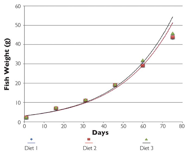 The fish that received diet 1 grew to a final average weight of 43.63 g at harvest, while fish fed diet 2 reached an average weight of 43.88 g. Fish fed diet 3 reached an average weight of 45.82 g (Table 1, Figure 1).