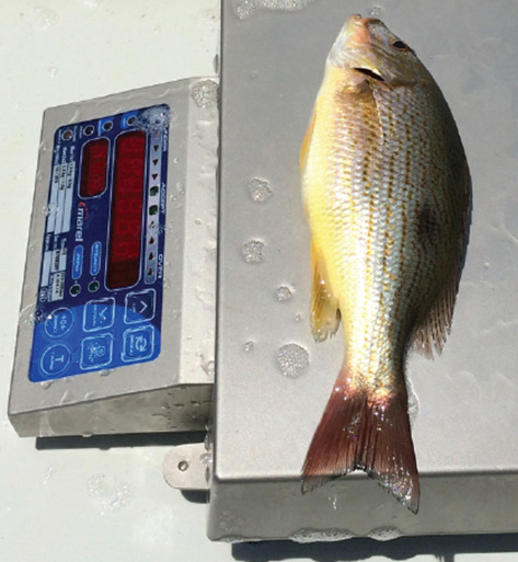 Feeding was ad libitum with a target of four daily feedings, but climatic conditions affected feeding. It was found that 60 percent of the time, fish fed 4 times/day. About 17 percent of the time, fish fed three times daily; 11 percent of the time, fish were fed once or twice daily; and 12 percent of the time, the snappers went without food. Water quality parameters during the feeding demonstration were very stable, with an average temperature of 27.6 ± 0.45° C and dissolved-oxygen concentration of 5.38 ± 0.94 mg/L.