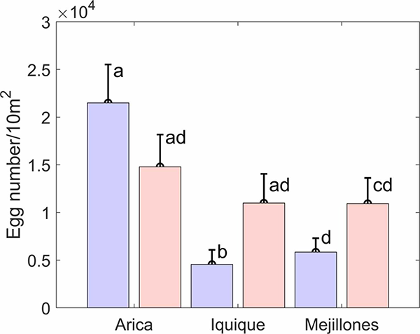 The Peruvian anchovy (Engraulis ringens) is a small pelagic fish that forms large, dense surface schools, has a short life cycle, a fast growth rate, and a naturally high mortality rate. It has a wide distribution, playing an important ecological role in the Humboldt Current and supporting one of the most significant fisheries in the South Pacific. Although spawning events occur throughout the year, the main spawning season is observed during the austral winter, with a peak between August and September. However, Hernández-Santoro et al. reported a delay in the spawning period after 2009 for E. ringens in the northern region of Chile, which could have important consequences for their offspring’s survival, as a decoupling of spawning timing and larval food abundances can severely impact larval survival during their first weeks of life. Despite this, there is no information regarding the effect of this delay on egg abundance on a more local scale.