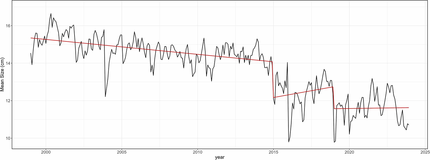 Intertwined biological and environmental factors – size reductions, biomass declines, upwelling variations and El Niño – have restructured E. ringens spawning