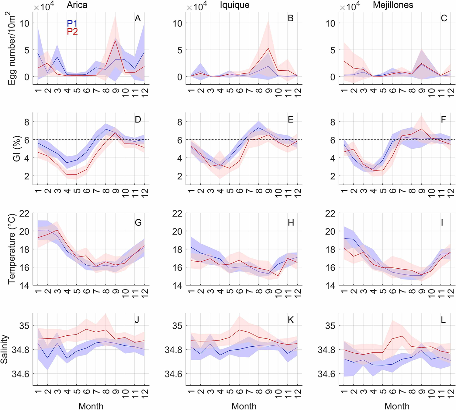 Contrastingly, Iquique recorded the lowest egg abundance in P1, but experienced a substantial uptick in P2, despite unchanged GI levels. This shift points to extrinsic environmental influences rather than intrinsic biological ones. Iquique’s coastal regime features more robust and persistent upwelling compared to Arica, which historically propelled eggs offshore, diminishing detectable abundances at nearshore sampling points during P1. The P2 surge in egg counts, coupled with an elongated primary spawning event, implies enhanced survival prospects, possibly due to moderated upwelling intensity that curbs turbulence and advective losses. Furthermore, this could reflect migratory influxes of females from adjacent zones seeking superior reproductive habitats. Such adaptive relocation patterns have been reported for other pelagic species.