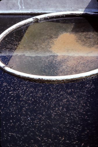 Harvest of tilapia fry from earthen reproduction ponds is a common method for producing fry suitable for sex inversion. One harvest strategy involves frequent partial harvests whereby schools of swim-up fry are harvested once to six times daily using hand nets or small seines.