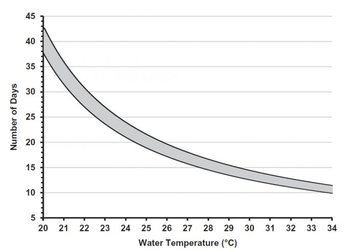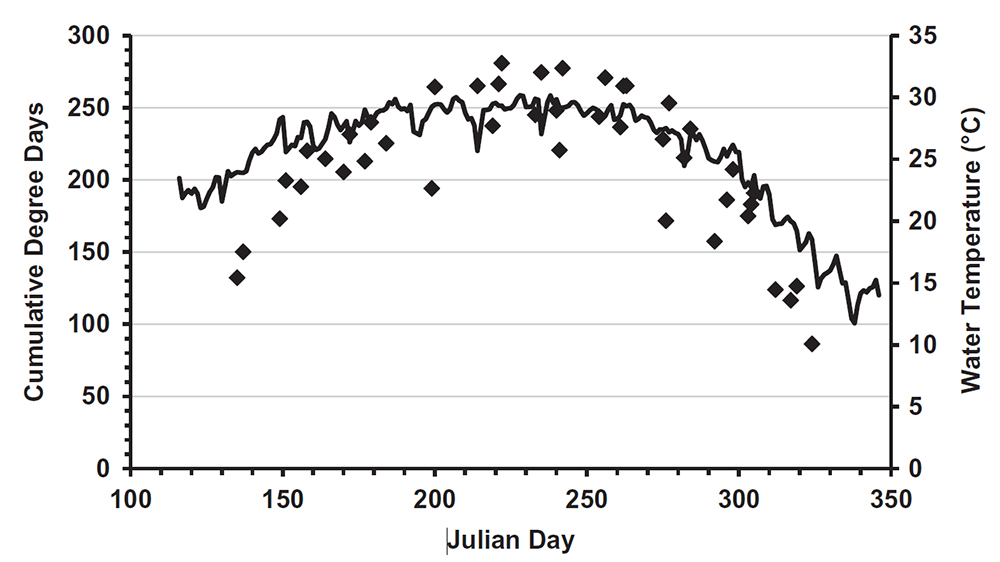 Findings based on degree days and demonstrated for earthen ponds in subtropical climates