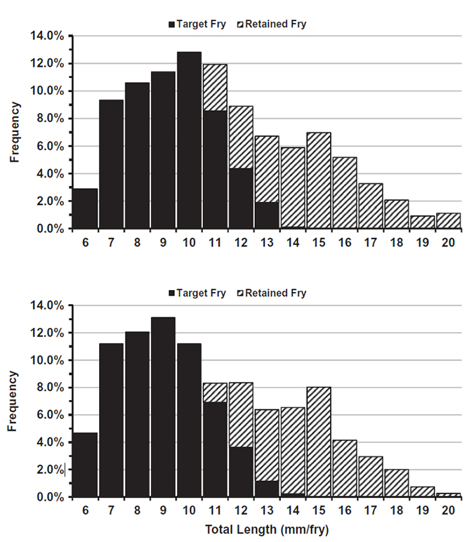 Variation in total fry production across all trials in the present experiment was high and was consistent with the variability noted by others. As the cumulative degree days increased, greater numbers of fry exceeded the target fry size range because of the additional time and/or higher temperatures available for growth. More variable fry productivity at higher cumulative degree days could be partially the result of predation on sac fry by larger fry.