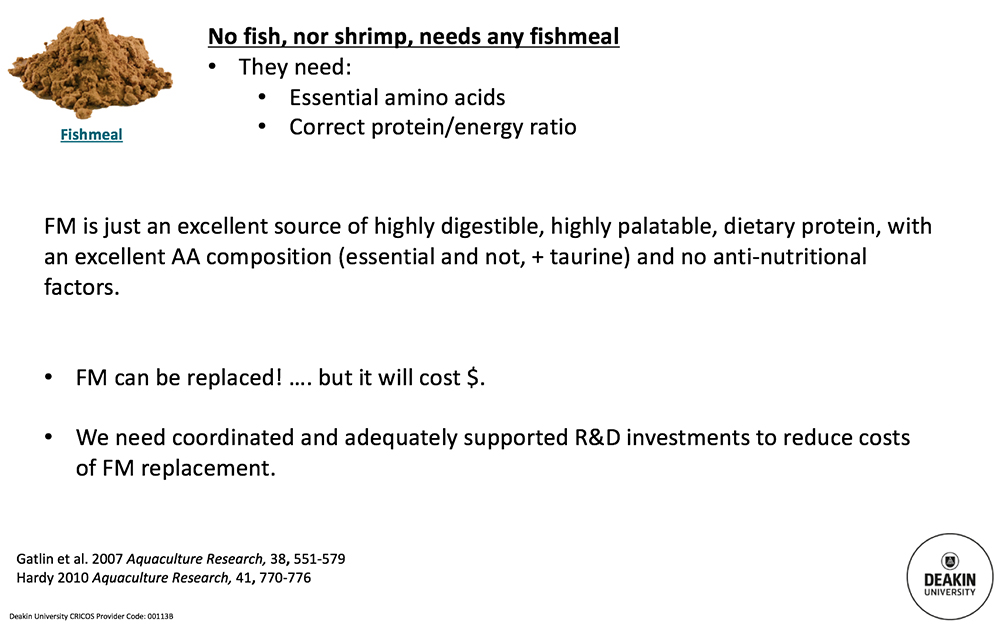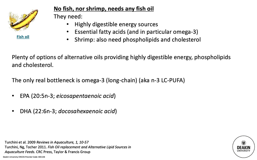 “We need coordinated and adequately supported R&D investments to reduce costs of fishmeal replacement,” said Turchini. “The only real bottleneck is the long-chain omega-3 fatty acids, essential for optimal growth. Optimal growth is different from simple physiological requirement.”