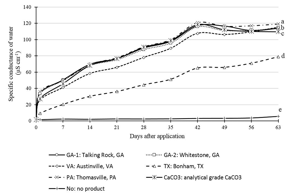 After 63 days, PA samples presented the highest SC value, which was different from all other samples, including CaCO3. The sample TX had the lowest SC after 63 days. There was reasonable correspondence between the 24-hour (short term) and 63-day (long term) SC results, indicating that the 24-hour SC assessment might be used to quickly evaluate the solubility of different limestone sources in water. Analytical-grade CaCO3 could be used as a standard in such a test.