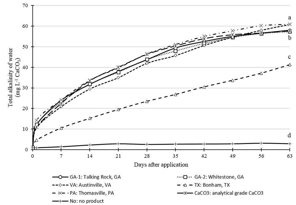 Difficulty often is encountered in attempting to increase alkalinity above 60 mg L-1 by liming because of the low solubility of limestone. TX reached a TA slightly above 40 mg L-1 after 63 days, and it was significantly inferior in solubility to the other samples. Therefore, there were significant differences between the limestone sources for the TA of water, which can be used as an index of solubility. Despite their similar particle size, the products affected TA differently.