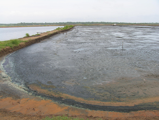 In some coastal areas, soil at a depth of 0.5 to 1 m below the surface, may have iron pyrite concentrations of 1 to 5 percent or more. This situation is particularly common in and around mangrove habitat and other coastal wetlands. When exposed to the air, iron pyrite oxidizes to form sulfuric acid and iron oxides. Such soils are known as acid-sulfate soils. Ponds built in acid-sulfate soil typically have very acidic bottom soil with pHs of 2 to 4, and remediation, though possible, is a time consuming and difficult procedure. It is best to avoid acid-sulfate areas when selecting a site for aquaculture ponds.