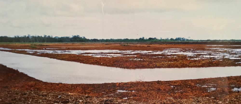 When ponds with high iron concentration in bottom soil are drained and their bottoms dried, there will be a reddish layer of iron hydroxide over the bottom. Although this is not a harmful situation in itself, it often indicates that the sediment is acidic and would benefit from liming.