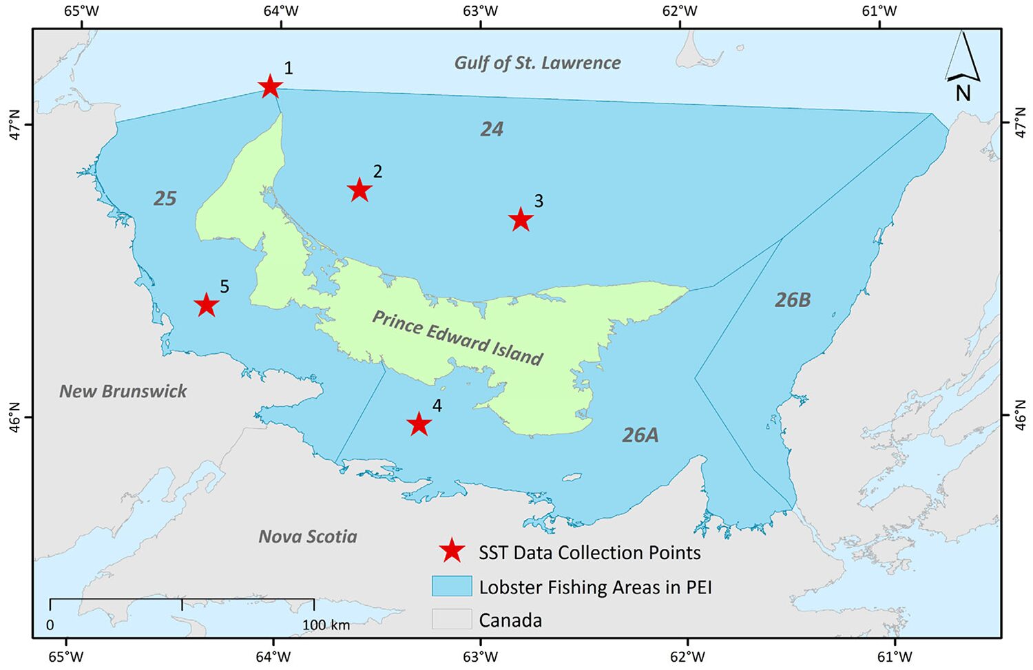 This study addressed how do historical SST patterns influence lobster landings in Prince Edward Island. Monthly average SST around PEI was obtained from 1982 to 2021 from the Surface Temperature Group at the University of Reading, UK. Data were collected from five location points within the LFAs in PEI (Fig. 1). Thirty-two-year summaries of PEI lobster landing data from the period 1990 to 2021 were collected from the official website of Fisheries and Oceans Canada. Additionally, landing information from 2003 to 2022 for each LFA in PEI was collected from Fisheries and Oceans Canada’s office