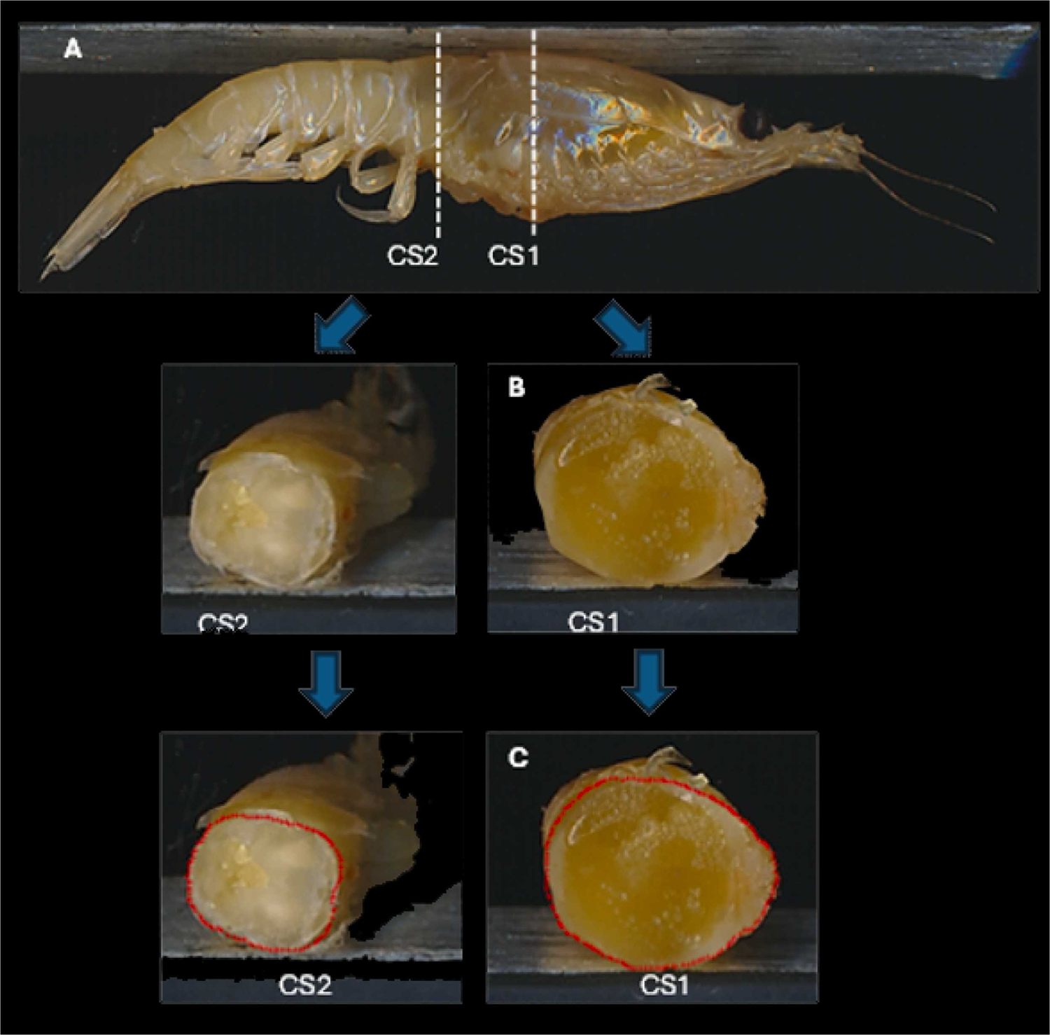 The morphological measurements were carried out separately for each maturity stage, one by one formalin preserved individual at the time. Each individual was placed stretched on a flatbed scanner for subsequent length measurement using the IMAGEJ software. Frozen individuals were first cut perpendicular to the length of the body at CS1 and CS2 using a scalpel, then they were placed on the flatbed scanner to acquire the images and the shape description of CS1 and CS2 (Fig. 1).
