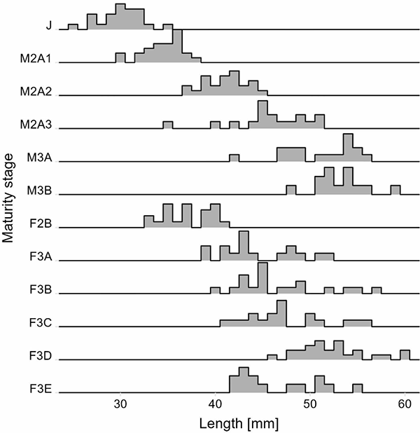 Understanding the connection between maturity stages and morphology in relation to size selectivity in trawls is essential for assessing the impact of various fishing gear on the population structures of harvested species, their fishing mortality rates, and the efficiency of the gear used.