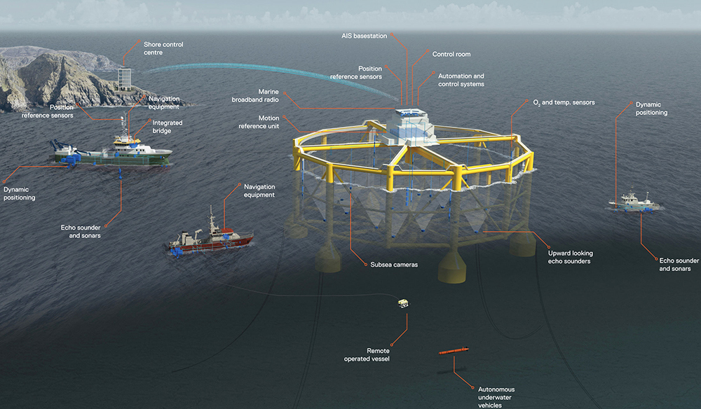 Conditions at such exposed sites, up to several miles offshore, boast steady currents that limit exposure to sea lice infestation and benefit the health of the fish, according to Kongsberg. The facility is designed to be fully automated, requiring a crew of three to four people. It can also be remotely operated, according to Kongsberg.