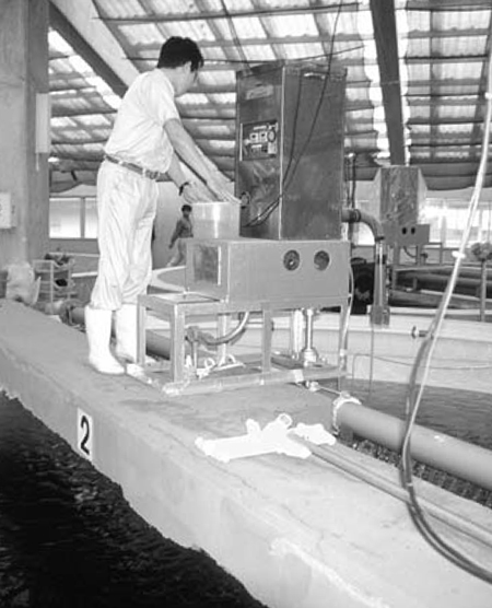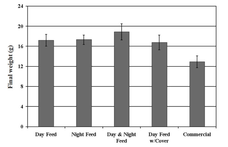 Feeding trials with a new shrimp feed were conducted at the Oceanic Institute with three different feeding regimes and two tank covers.