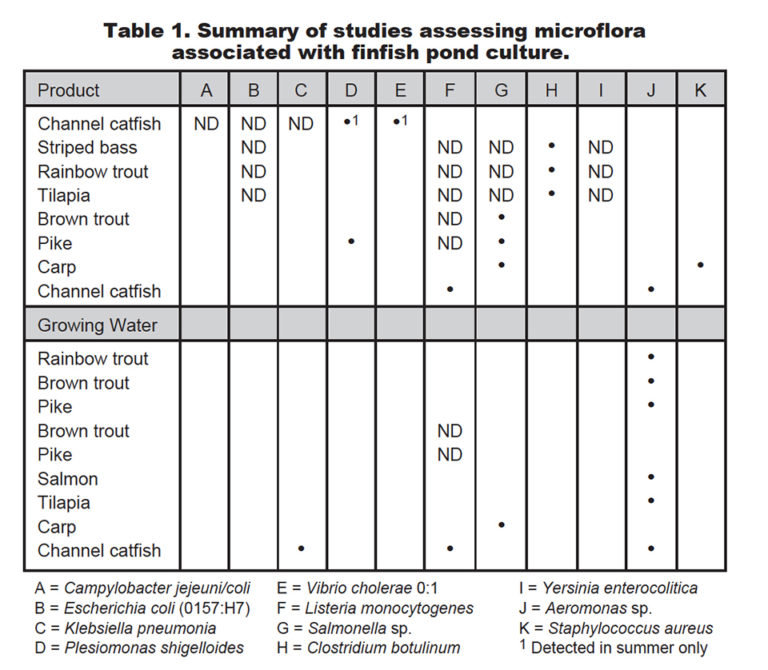 The microbial flora of farmed seafood products, particularly the microorganisms considered human pathogens, are important to individuals and agencies.