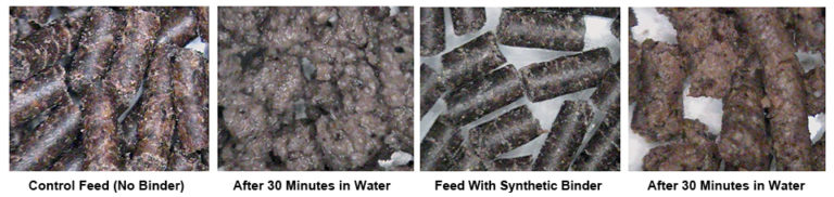 Synthetic and natural binders that provide increased water stability are often used without consideration of the final dry or wet pellet texture of the shrimp feed.