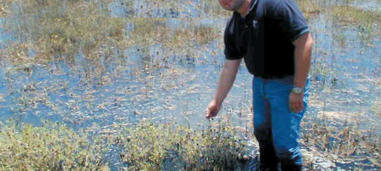 This paper reports on the use of a constructed saltwater wetland system to treat effluent from a pilot facility consisting of four 2-ha ponds.