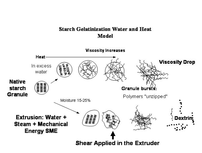 In the pelleting process, the starch granule may swell in the preconditioner but it will not rupture. In contrast, in the extrusion process the swelling that started in the preconditioner is also accompanied by the mechanical energy input produced by the screws, the particles rubbing against each other and particles rubbing against the walls of the barrel. This additional energy causes the starch granule to rupture, followed by a decrease in the viscosity as the granule is ruptured even further by the continued action of the mechanical energy input.