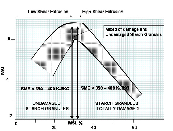 The relationship of SME to starch damage has been investigated by Smith (1992. Food Extrusion Science and Technology. Marcel Dekker Inc.). This author demonstrated a general relationship of WAI and WSI as a function of structural changes caused to the starch when it was subjected to various degrees of mechanical energy. The main parameters studied where screw configuration, moisture content and barrel temperature. Changes in these parameters caused the SME to vary from 180 to 750 kj/kg.