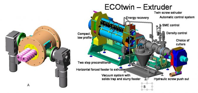 Shrimp aquafeeds are traditionally manufactured using a pelleting system with long residence time pre-conditioners. The latter pre-cook the starch portion of the feed to improve its binding ability, to produce a feed with high water stability. But the process of pelleting at moisture levels close to 17 percent is more art than science. It requires highly experienced operators, and in most cases the process cannot be maintained at sustainable rates for several hours without having a stoppage. At the same time, the use of a post-conditioner has become a requirement in order to increase the degree of cook, thus improving the water stability of the feed. In the pelleting process, most of the cooking is due to the shear produced on the surface of the pellet as the meal is formed and passes through the die, and not due to the steam addition added in the pre-conditioner.