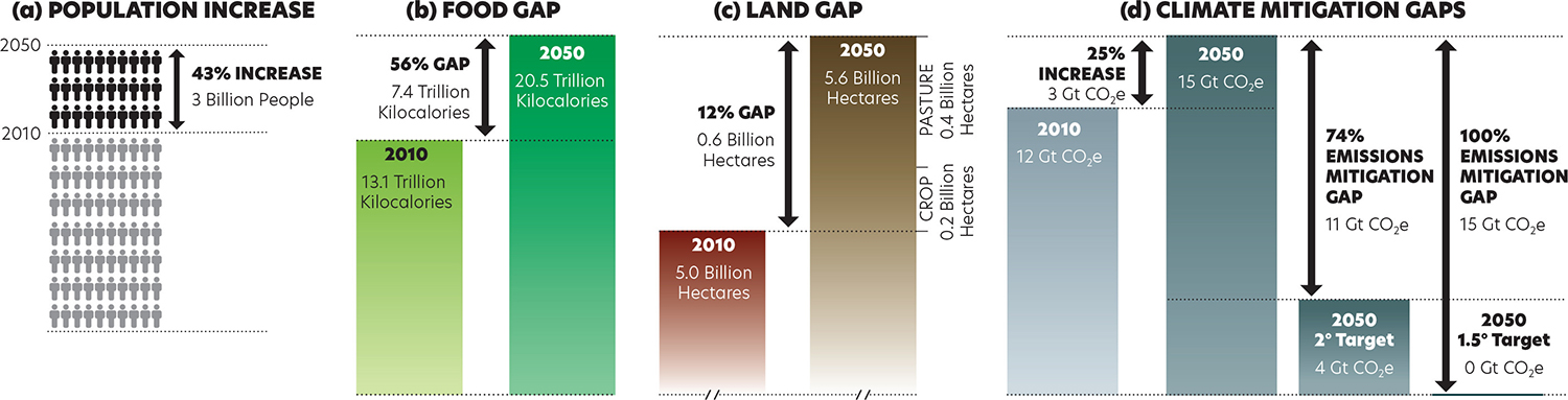 Para 2050, se proyecta que la población mundial se acerque a los 10 mil millones de personas. Se prevé que la producción mundial de alimentos deberá aumentar hasta en un 56 por ciento para satisfacer las demandas nutricionales de esta población creciente y cada vez más próspera. Pero incluso la producción de alimentos actual es insostenible e insuficiente.