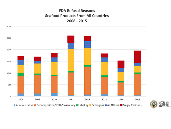 The U.S. Food and Drug Administration refused nearly 2,000 shipments of imported seafood in 2015, one of the highest totals in recent years (see Fig. 1). More than one-fourth of those refusals were because illegal substances were detected, most likely veterinary drugs administered to farmed fish and shellfish. It was the third-straight year of increased drug-related refusals.