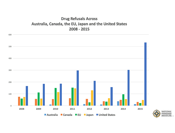 What’s more, the agency refuses more seafood shipments than many other major markets (see Fig. 2) due to the detection of illegal substances. In 2015, FDA refused 534 shipments due to illegal drugs, second only to “decomposition, filth or unsanitary” product conditions. It’s more than 10 times the number of refusals by Japan (49), one of the world’s biggest seafood importers, according to NFI’s data.