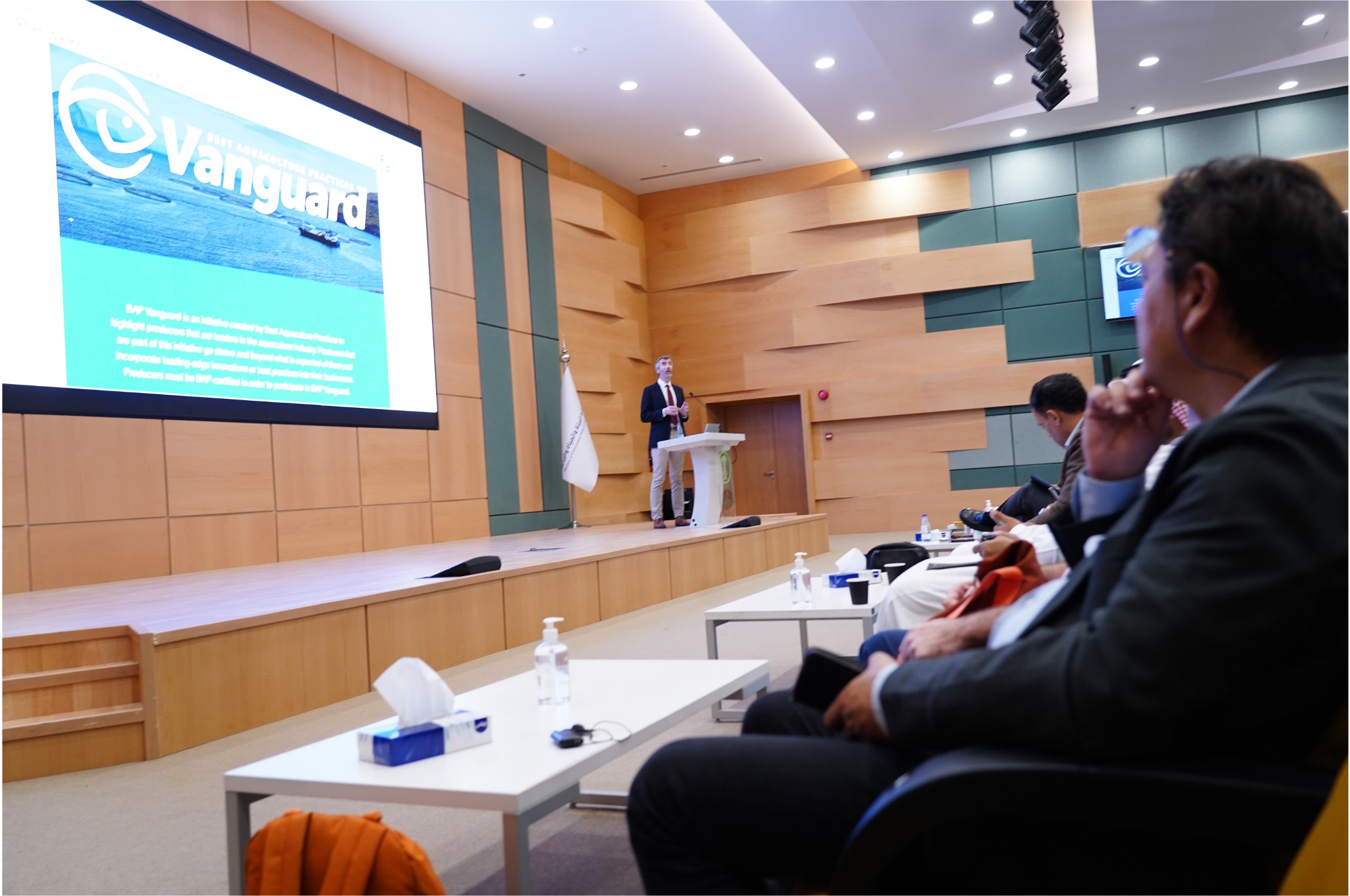 The event was attended by some 40+ persons, including the Assistant Deputy Minister for Livestock & Fisheries of MEWA (Dr. Ali Al Shaikhi), the VP of Operations of the National Fisheries Development Program (NLFDP) of MEWA (Mr. Philippos Papageorgiou), the Director of Aquaculture of NLFDP (Mr. Ibrahim Alzahrani), members of the Saudi Aquaculture Society (SAS), BAP certified producers (including the largest in Saudi Arabia, National Aquaculture Group NAQUA), and a number of producers interested in gaining BAP certification. Certified facilities in the Kingdom also include Jazadco, Aqua Bridge Company, Alnasiriya Works Establishment, Maram Feed Mill Company, Rasheed Al Ballaa Farm for Aquaculture, Saudi Fisheries Company, and Tabuk Fisheries Company.
