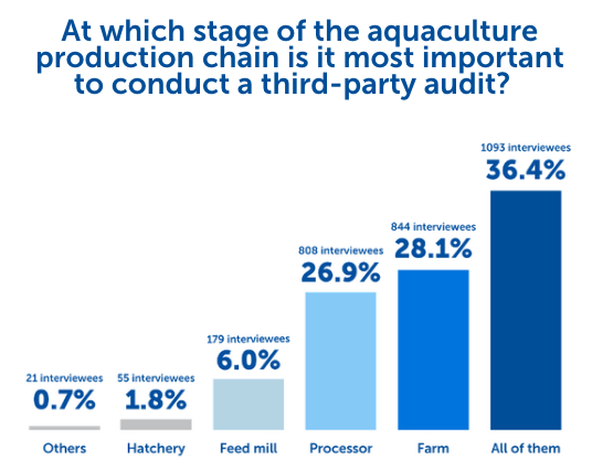 When asked which part of the aquaculture production chain was most important for conducting a third-party audit, more than a third (36.4%) said that all parts of the production chain are important, followed by the farm at 28.1%.