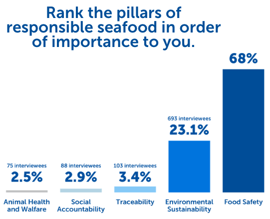 The consumers surveyed are between the ages of 16 and 65 and consume fish at least two to three times a month. When asked to rank the pillars of responsible seafood in order of importance to them – environmental sustainability, social accountability, food safety, animal welfare and traceability – 68% said food safety was the most important, followed by environmental sustainability at 23.1%.
